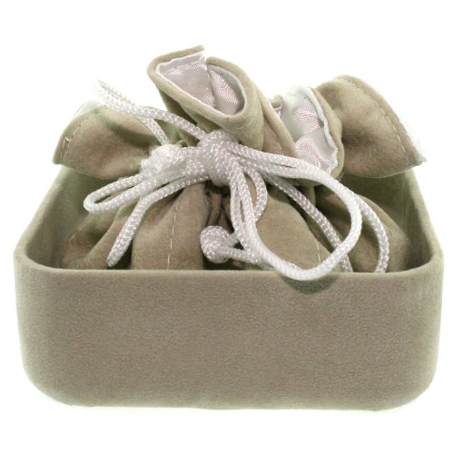 Present a special gift in this designer keepsake bag with matching box by Bucasi. The perfect size pouch to place a small gift or jewelry. The decorative bag is ideal for gifts, wedding favors, bridal shower favors and more. The compact bags are made of a high quality ultra suede beige cream fabric with 6 slots in white satin, a double pull drawstring and knotted ends. The matching outer square box features the same ultra suede beige cream fabric with a well constructed bottom and lid. The pouch and box can be used for party packaging or travel organizer to hold jewelry and other small items. Pouch Measures: 9" Round. Box Measures: 4x 4x 1.5"H Quality Made. Exclusively by Bucasi